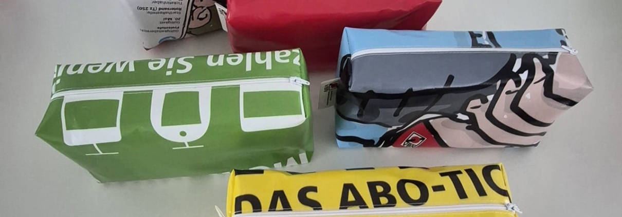 Für die Kommunikation des breiten Angebots der Vereinigte Stadtwerke GmbH werden auch PVC-Banner eingesetzt. Nach der Verwendung durften wir daraus Brustbeutel und Umhängetaschen nähen.