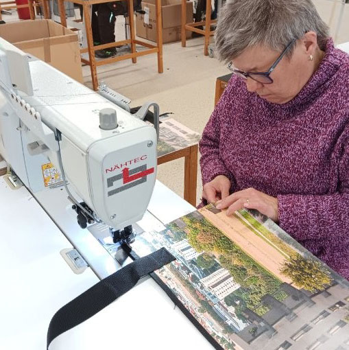 Menschen mit Behinderungen in der Lebenshilfe Bruchsal-Bretten e.V. nähen daraus stylische Taschen wie Messenger-Bags, Einkaufstaschen, Pressemappen, Laptop-Taschen und Brustbeutel – jedes Stück ein individuelles Designobjekt. In der VAW werden die Schlampermäppchen, Kulturbeutel genäht und auch bei großen Aufträgen die Tasche #4 und Tasche X.
